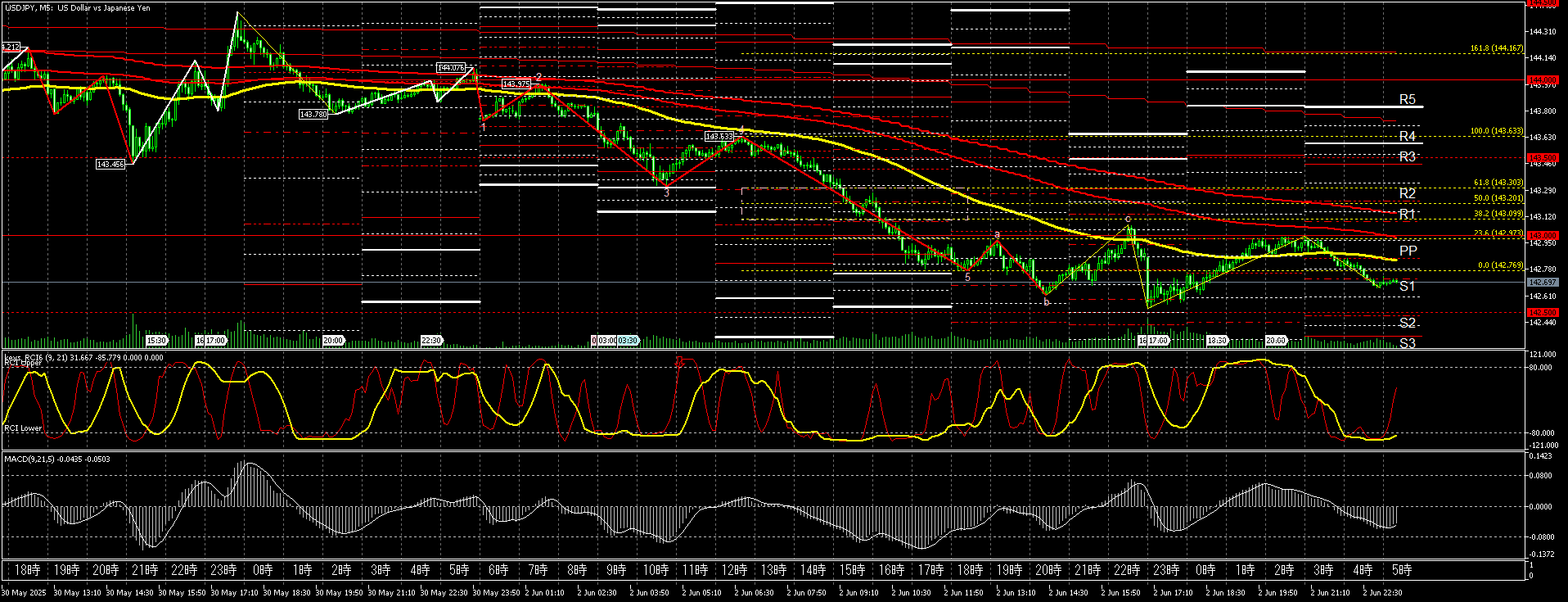 ・20時25分頃 142.61付近でMACDシグナルとRCI中期反転。 約45.5 pips円安。