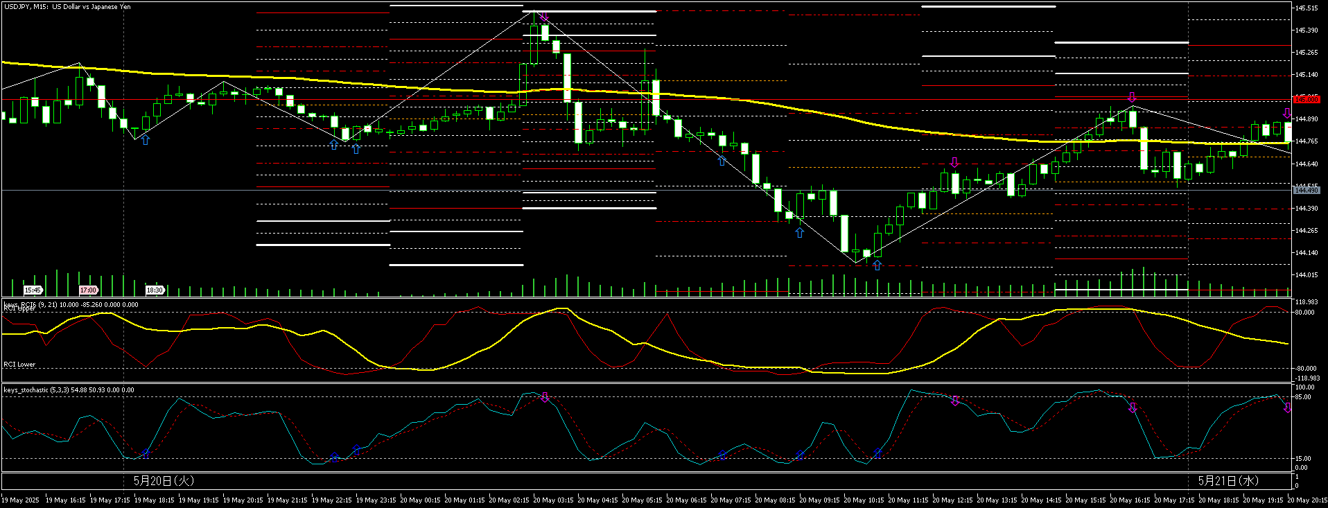 15分足:RCI短期 △,RCI中期 △,stochastic 〇